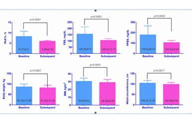 Results: 71 patients were identified with mean age- 40.90±11.25 years, males- 76.06%, mean HbA1c= 8.27±2.5%, mean (Fasting Blood Sugar) FBS= 155.8±57.0mg/dL, mean Post Prandial Blood Sugar (PPBS)= 179.4±85.81 mg/dL, mean Body Mass Index (BMI) = 30.50±4.0kg/m2, mean Body Weight (BW)= 86.34±13.36kg and mean Waist Circumference (WC)= 104.2±12.32cm. LIRA treatment brought out positive results in terms of improvements in various clinical parameters viz. HbA1c was lowered to almost near normal levels of 5.96±0.35% (p<0.0001), FBS to 105.5±13.73mg/dL (p<0.0001), PPBS to 105.0±20.20mg/dL (p=0.0003), BMI to 28.99±3.85kg/m2 (p<0.0001), BW to 81.82±12.34kg (p<0.0001) and WC to 98.08±8.94cm (p=0.0017).