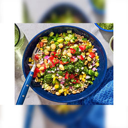 Evenly divide lentils, bell pepper, cucumber, jalapeño (if using), corn and quinoa between two bowls. Drizzle with
