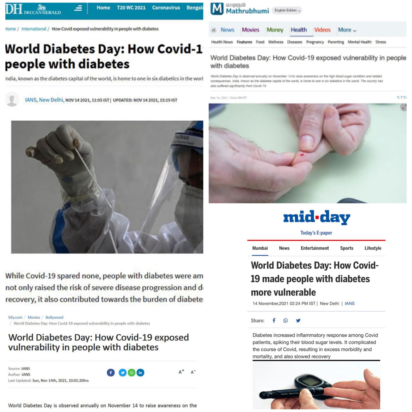 An article by Dr.Jothydev Kesavadev on ‘How Covid-19 Exposed Vulnerability In People With Diabetes’ was published in various online magazines including sify.com, Mathrubhumi online, Deccan Herald, Mid-Day, Telugu stop.com, Odishatv.in etc on World Diabetes Day, 14 November 2021.