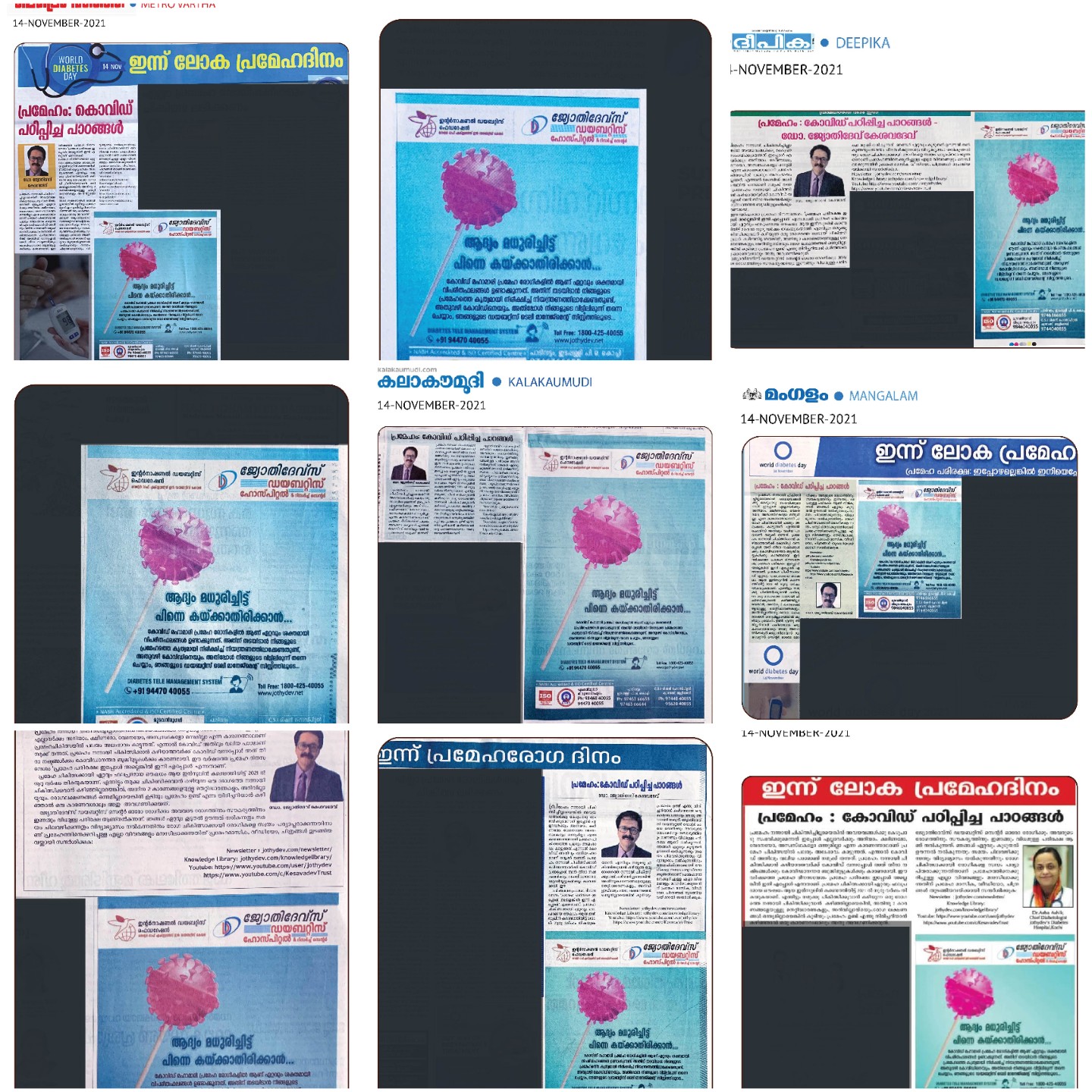 With a view to spreading awareness on World Diabetes Day, articles by Dr.Jothydev Kesavadev, Dr. Arun Shankar, Dr. Asha Ashik and advertisements for awareness were circulated via newspapers and magazines including Metro news, Suprabhatham Deepika, Deshabhimani, Kalakaumudi, Mangalam, Janayugam, Janabhumi, Indian Express, Times of India, Hindu, Kerala Kaumudi, Mathrubhumi, Malayala Manorama etc.