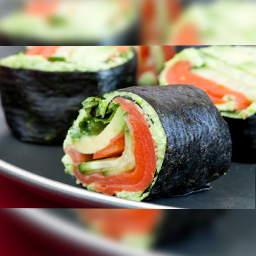 - Place one nori sheet on a flat plate or cutting board. Place one romaine lettuce leaf on top of the nori sheet close to one of the edges.
