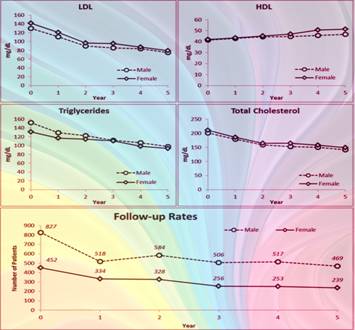 We examined de-identified records of 1279 T2DM patients above 25 years of age who were treated for dyslipidemia (65% males, mean age 51.9 ±11.1 years; 35% female, mean age 52.6 ±10.8 years). Patients were followed up via a Diabetes Tele Management System (DTMS®) by a multi-disciplinary team of doctors, dieticians, pharmacists, psychologist etc. where in addition to the glycemic management, compliance to statins and anti-hypertensives are ensured. Follow-up rates showed sharp dropout after one or two visits to the clinic (37% males, 26% females), followed by relatively steady pattern in subsequent years. Lipid parameters of both dropouts and followed-up patients were similar initially, with average LDL levels of 135mg/dL in females and 124mg/dL in males(Fig.1).