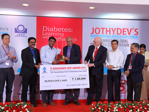 Dr Riddhi Das Gupta, Assistant Professor, Christian Medical College, Vellore, was presented the prestigious P.Kesavadev JPEF Award 2017 for ‘Young Researcher in Diabetes’. The award comprising of a cash prize of INR lakh, Gold medal, Citation and Travel grant was presented to Dr Gupta during ‘Jothydev’s Professional Education Forum (JPEF) Annual Global Diabetes Convention 2017’ by Dr Satish Garg (USA).The expert panel consisting of Dr Georgi Abraham(Chennai), Dr Ashok Kumar Das(Puducherry), and Dr Jothydev Kesavadev(Trivandrum) unanimously selected the award winner for his pioneering work on Fibrocalculous Pancreatic Diabetes (FCPD).